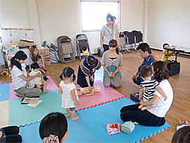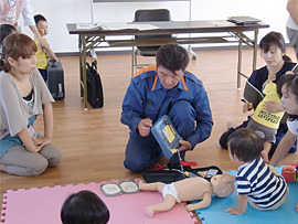 | ■「応急手当講習会〜乳幼・小児の事故と応急処置について」を開催しました。■ 平成22年9月14日(火)に、応急手当講習会を開催しました。今治消防本部 消防課 課長補佐 池田久志さんを講師に招き、乳幼・小児の事故と応急処置について学びました。少し秋の風が混じり過ごしやすくなった中、13組の親子が参加し、わいわい賑やかな講習会でした。 ケガや病気の時の対処法や、救急車を呼ぶ時に必要なこと、小児に対するAEDの使用等をとても分かりやすく教えていただきました。 利用者の方からは、「鼻血がでた時の正しい対処法はどうすればよいか。」「救急車を呼んだ時は、かかりつけにつれていってもらえるのか」など積極的な質問も出ていました。 緊急の時に慌てず適切な対処をすることの重要さを実感しました。 |