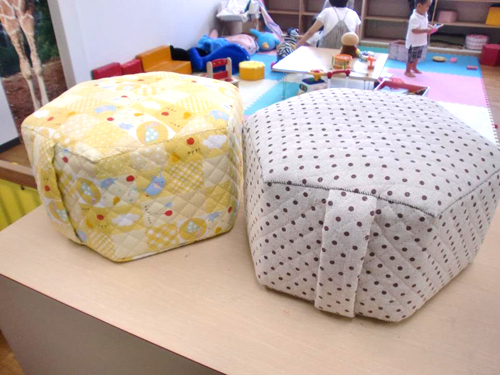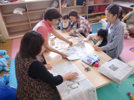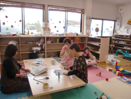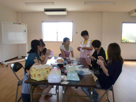 お手玉づくりでは、学生以来?針を持っていなかったというお母さんに、スタッフがまるで自分の娘に教えるように技を「伝授」していたのがとても印象的でした。 おおきなお手玉を作ることができたお母さんは、「自分でも作ることができたという達成感でいっぱい。『お母さんが作ったんよ!』ってみんなに自慢します。」と、にこにこでした。 |