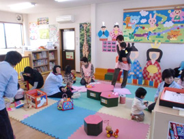 お母さん達がお勉強の間、スタッフは託児に大忙しです。 子どもたちは、みんな泣かずにお母さんのお勉強を応援しましたよ! |