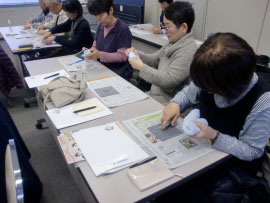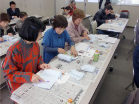 | ■屋内清掃講習会を実施しました。■ 平成26年12月5日に、株式会社サニクリーンさんのご協力をいただき、屋内清掃講習会を開催しました。 座学だけでなく、カーペットのシミ抜きの実習や窓ふきの実技を行うなど、きれいに掃除をするコツを丁寧に教えていただきました。 トイレやお風呂場、台所、窓ガラスなど、コツを学ぶことで、とてもきれいに掃除することが出来ることが解りました。 この講習会で学んだ知識を会員の皆さんが今後の就業に役立てていただける事を期待します。 |