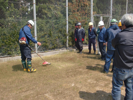 | ■草刈講習会を実施しました。■ 飛石が発生しないと言われる草刈機(カルマ)の使い方や、刈払機の安全な使い方についての講習会を開催しました。 会員の皆さんも、草刈機の飛石には苦慮しており、熱心に先生の話に耳を傾けていました。 |