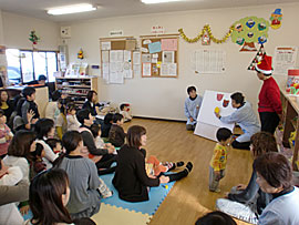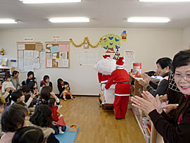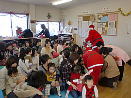 | ■クリスマス会の様子■ 12月7日にクリスマスお楽しみ会を開催しました。 なんと、36組もの親子が集まり、「おぉきくなぁれ」は満員! クリスマスの歌を歌ったり、お話を聞いたり・・。楽しさもピークに達した頃、サンタさんが登場!! 突然のサンタさんにお母さんも子どもさんも大喜びでした。 よい子にしてたら、来年も「おぉきくなぁれ」に来てくれるよね? サンタさん! |