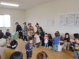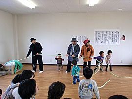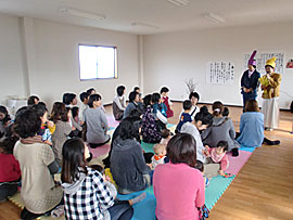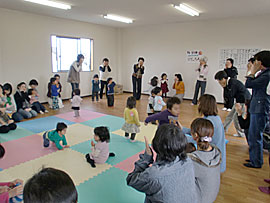 | ■おひなまつり会の様子■ 平成22年3月3日に「おひなまつり会」を開催しました25組もの親子が集まり大変な賑わい。クリスマス会では本当に沢山の方々が来てくださったので、今回はおぉきくなぁれの2階を活用しました。 スタッフによる大型絵本「おおきなカブ」の読み聞かせの後、みんなでおおきなカブを引っ張りました。カブが抜けた時には、子供達が大喜び。大歓声でした。 また、「シルバーダンサーズ」によるうさぎのダンスは大盛況で、アンコールまで飛び出し、みんながお腹から笑ったひとときでした。 |