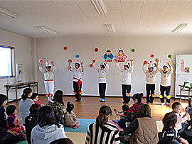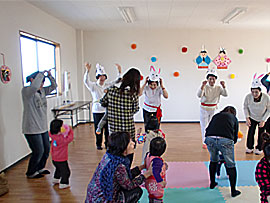 | ■おひなまつり会の様子■ あたたかな陽射しの中、21組46名の親子がわいわいあつまりました。いろんなおひなさまが見守る中、スタッフによるうさぎのダンスや楽器演奏、手作り絵本の読み聞かせ、リズム遊び等で楽しい時間を過ごしました。 子どもだけでなく、大人も一緒に踊ったり歌ったり。みんなの笑顔がはじけました。 |
