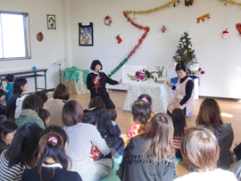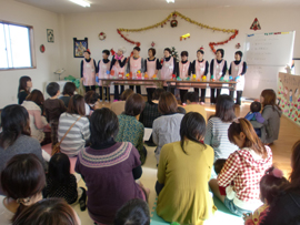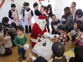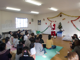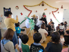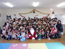 | ■クリスマス会の様子■ クリスマスの月12月とは思えない暖かい日、今年のクリスマス会にもたくさんのお母さんと子供さんが集まってくれました。 子どもも大人もワクワクのこの会ですが、誰よりもワクワクドキドキしていたのは、スタッフでした。企画、準備、運営とすべてをこなす「スーパースタッフ」達の笑顔がみんなを巻き込んでとても楽しいひとときとなりました。 |
