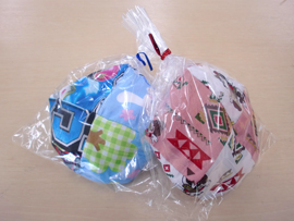 ▲大人の手のひらぐらいある、おおきなお手玉が今年のプレゼント。 スタッフがひとつひとつ手作りしました。 |