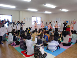 ▲スタッフのお手本のあと、子ども達も参加しました。かわいい指揮者に、会場が一段と盛り上がりました。 |