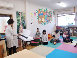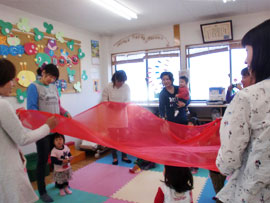 | ■リズムであそぼ♪■ 「おぉきくなぁれ」では、毎月いろいろなイベントを行っています。 お誕生日会や読み聞かせ会の他、リズムであそぼ♪と題して音楽に合わせて歌ったり体を動かしたりするリズム遊びもしています。 平成26年3月17日(月)には、「東日本大震災の復興を願って」をテーマに、利用者のお母さんの企画によるリズム遊びを行いました。 歌に合わせておひざの上で遊んだり、大きなスカーフを使って遊んだり・・・。 最後には、遠い被災地に思いを寄せながら一日も早い復興を祈って「花は咲く」や「故郷」を 歌いました。 スタッフの活躍の場、利用者のみなさんの活躍の場としての「おぉきくなぁれ」でありたいと 思っています。 |