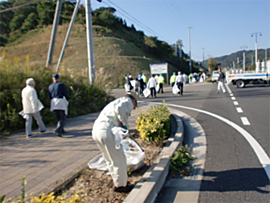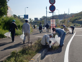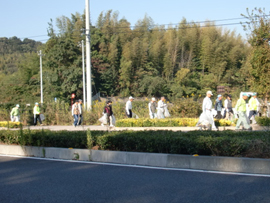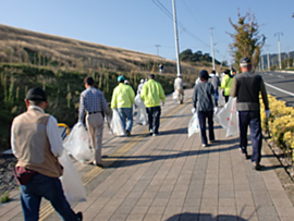 | ■イベントの様子■ 爽やかな秋晴れの空のもと、健康ウォーキングとボランティア清掃を行いました。このイベントは、10月の「シルバー人材センター事業普及啓発促進月間」に合わせて、ボランティア清掃を行い、会員の健康増進とシルバー人材センターの普及啓発を目的としたものです。86名の参加者が、平成26年10月26日に行われる国際サイクリング大会「サイクリングしまなみ」で使用される街路約5キロメートルを、ウォーキングしながら清掃しました。 世界中からたくさんのサイクリストが集まるとあって、会員もいつも以上におもてなしの心を込めて清掃をすることができました。 |