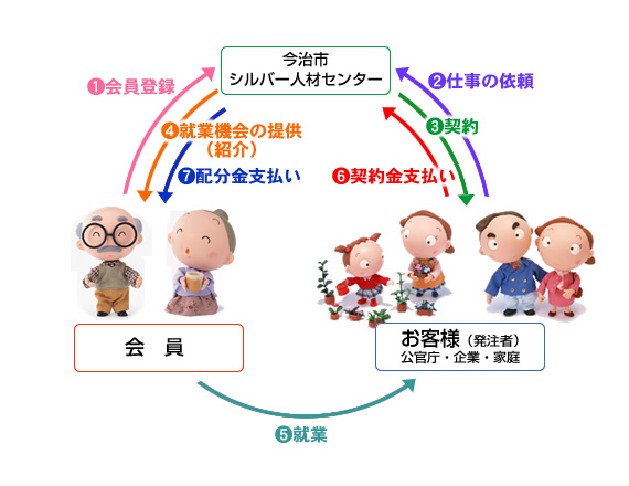 ●地域の家庭や企業、公共団体などから請負又は委任契約により仕事を受注し、会員として登録をした高年齢者に希望や能力に応じて提供することでその仕事を遂行します。